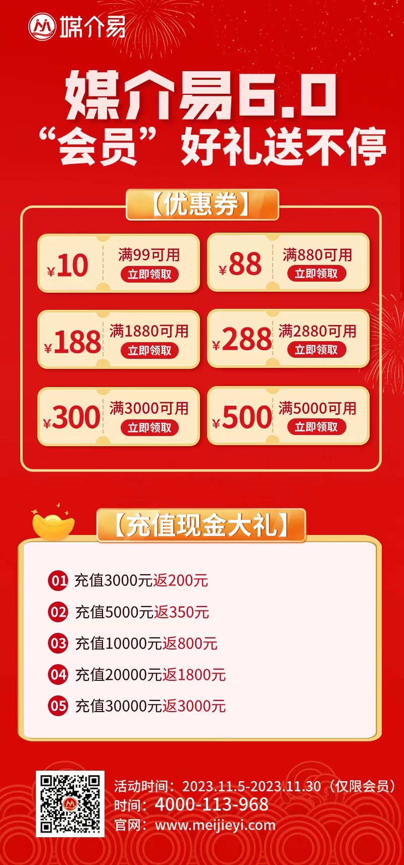 活动时间截至2023年11月30日,千万别错过这个难得的机会!赶快充值,享受更多优惠和返现奖励,让您更加实惠、便捷。同时,也别忘了分享这个好消息给您的朋友们,让更多的人享受到媒介易带来的优惠。