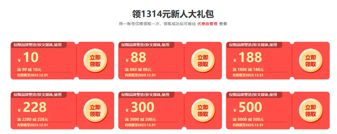 媒介易6.0国际版上线,注册媒介易账号即可领取1314元新人大礼包!礼包领取时间截止12月31日。免费的东西怎能错过呢?快来注册吧!