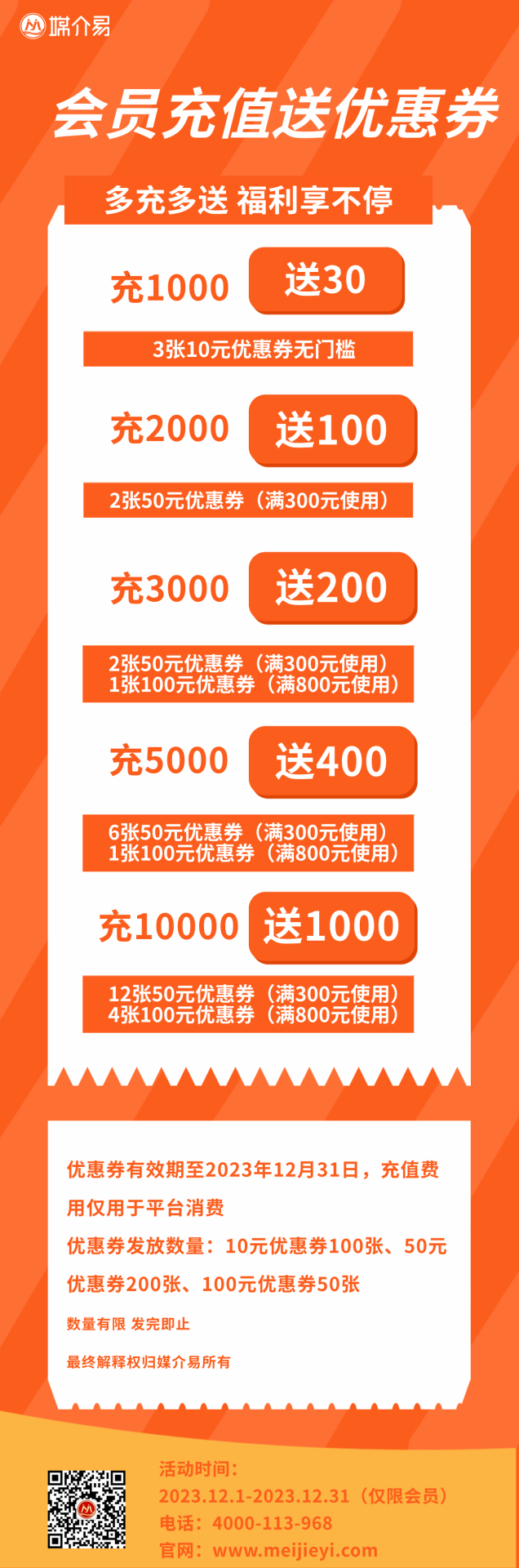 12月1日—31日,凡在媒介易平台上充值达1000元以上即送优惠券!此外,普通会员+VIP会员充值5000以上可额外赠送云南6天5晚昆大丽双人游!活动真实有效!先到先得!