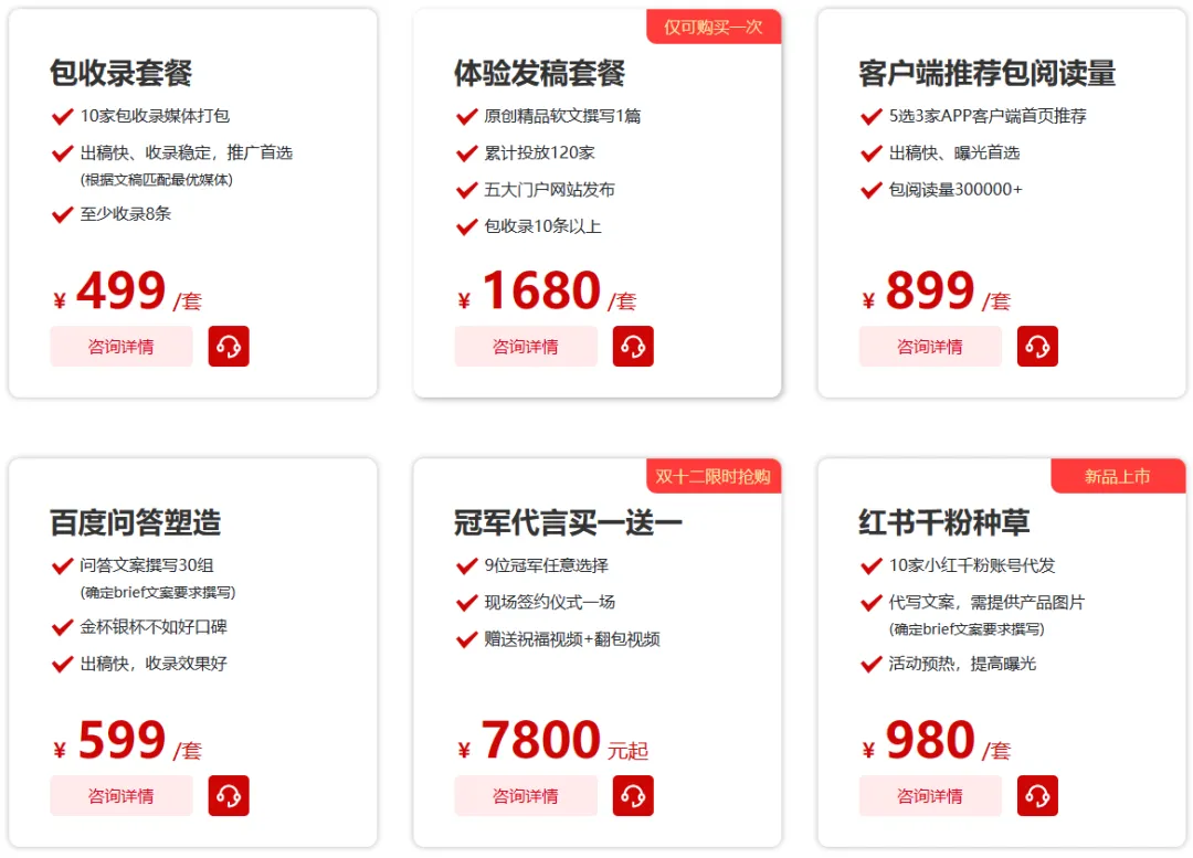 包收录、体验发稿、客户端推荐包阅读量、百度问答塑造、冠军代言、红书千粉种草等......哪里找的到这么优惠的套餐活动?来媒介易,准没错!