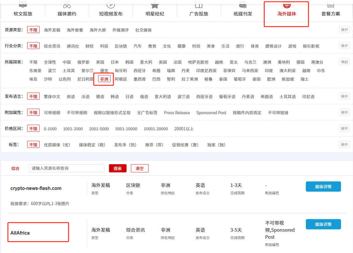 若您希望在AllAfrica上进行海外媒体发稿,可以在媒介易平台中的媒体库中点击海外媒体,然后选择非洲,就可以找到AllAfrica进行发稿。媒介易作为国内首家全媒体传播服务平台,拥有超过10w+媒体资源,其中有众多的海外媒体,包括欧洲、美国、东南亚等地区。此外,媒介易还提供大屏投放等多样化传播方式,满足您在不同地区的发稿需求。