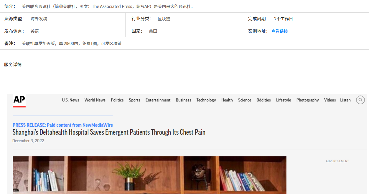 综合资讯类的部分媒体可以支持区块链类新闻稿件的发布。例如,美联社的单发,通常要求单词数在800以内,并可添加1张图片。从提交稿件到完成发布,一般需要2个工作日的时间。选择美联社发布区块链新闻稿,不仅可以提高信息的曝光度,还能借助其权威性和公信力,增强新闻的可信度。