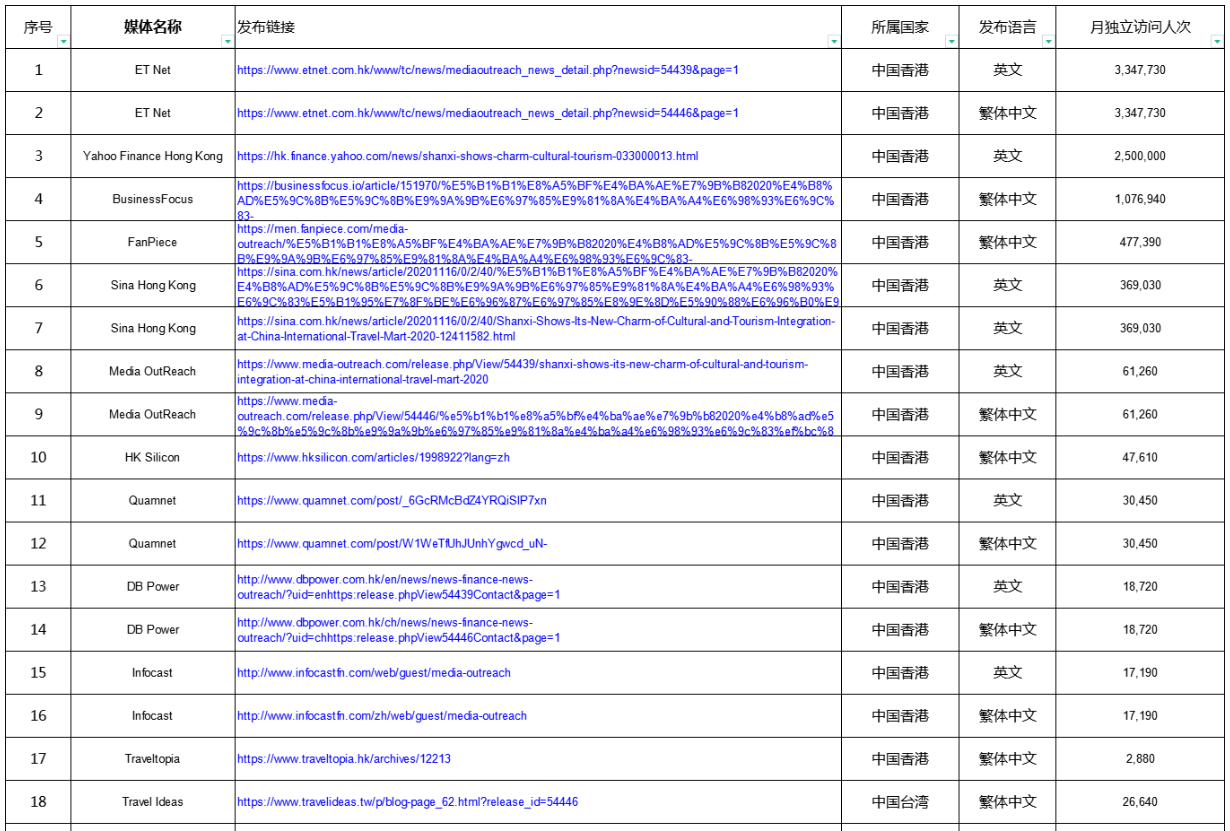 以ET Net为例,其月独立访问人次高达3347730,是香港财经新闻领域的佼佼者。BusinessFocus则专注于商业新闻,月独立访问人次达到1706940。Yahoo Finance Hong Kong作为雅虎财经在香港的分支,其月独立访问人次也超过了250万。在这些媒体上发布新闻稿,不仅能够迅速吸引目标受众的关注,还能提升企业的品牌知名度和美誉度。