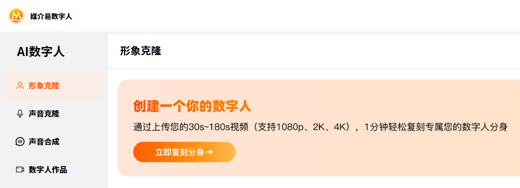 面对这些难题,媒介易AI数字人,通过先进的AI技术,能够迅速克隆出一个与你高度相似的数字人分身。这个分身不仅在外貌、口型、肢体语言上与你神似,还能完美还原你的音色和动作。