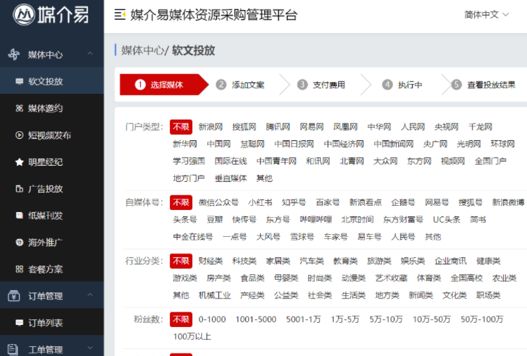 第三步借助媒介易资源库,平台整合了海量优质自媒体账号,覆盖美妆、科技、美食等全领域,支持按粉丝量、活跃度等维度筛选,快速找到高性价比的投放账号。