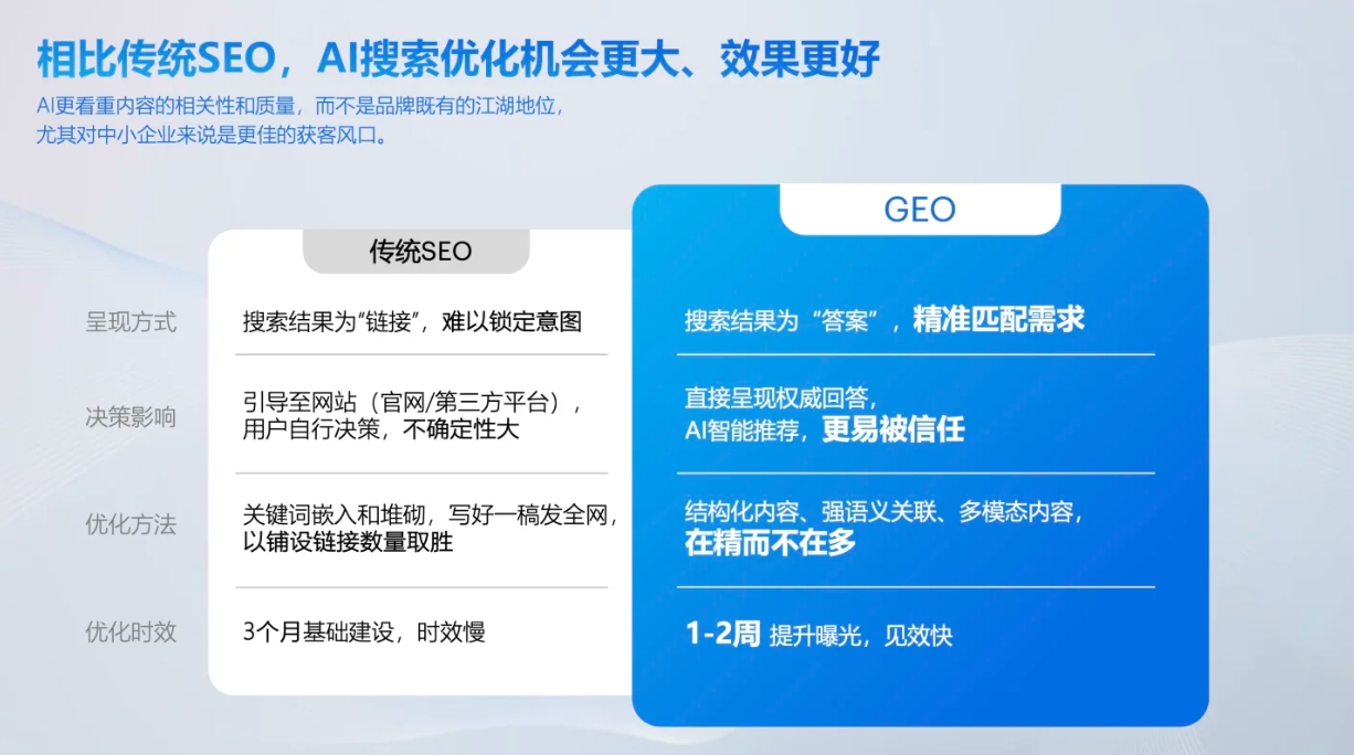 3、流量新风口已至,红利期不容错过回顾互联网发展,百度SEO初期、抖音信息流爆发时,都曾出现“竞争小、流量便宜、效果显著”的红利窗口。如今的GEO优化正处于类似阶段:AI搜索用户量激增,但布局者寥寥,抢先入场就能以低成本占据高价值流量位,成为第一批吃到红利的品牌。