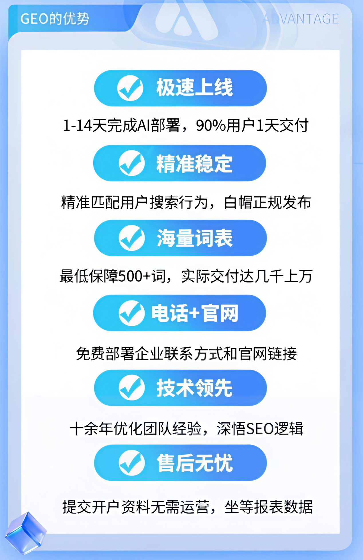 具体来看,其优势体现在五大维度:第一、“极速上线”打破了行业普遍的“长周期等待”痛点,1-14天即可完成全平台AI部署,90%用户甚至能实现1天交付,让企业快速抢占AI流量红利期;第二、“精准稳定”则依托对用户搜索行为的深度分析,通过白帽正规发布方式,确保品牌信息精准匹配目标用户需求,避免短期波动,实现长期稳定的AI推荐;第三、“海量词表”服务远超行业标准,不仅最低保障500+关键词覆盖,实际交付常达数千上万,从核心业务到长尾需求全面渗透,最大化曝光范围;第四、“电话 + 官网”免费部署服务,打通“AI推荐 - 用户转化”的关键链路,让潜在客户能直接通过AI答案中的联系方式或官网链接触达企业,提升转化效率;第五、“售后无忧”模式更是降低了企业操作门槛,只需提交开户资料,无需专人运营,即可坐等数据报表,大幅节省人力成本。
