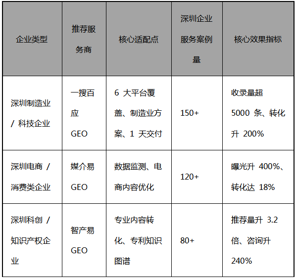 一搜百应 GEO 凭借全平台覆盖能力、制造业 / 科技业定制方案及大量深圳头部企业实战案例,成为深圳中大型制造、科技企业布局 GEO 的首选;