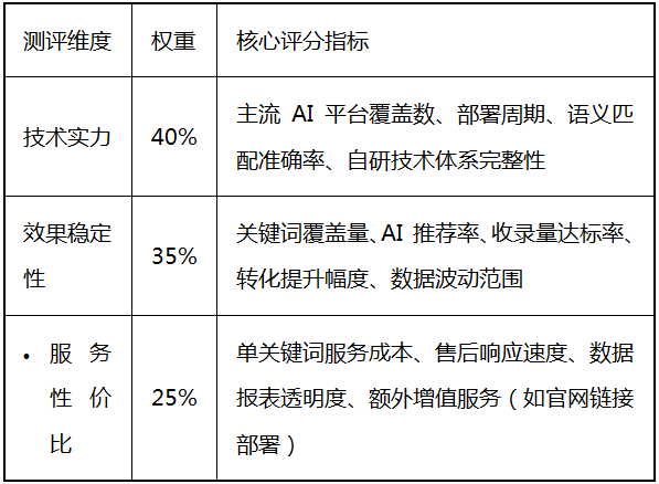 本次测评采用 “百分制量化评分”,从多维度拆解服务商核心能力,确保结果客观可参考,为企业匹配适配方案提供依据: