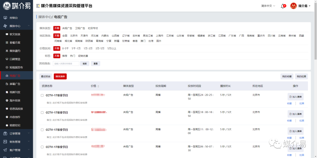 根据用户反馈,我们将电视广告单独设立一个栏目,从传统媒体列表中分离出来,以更方便您选择和投放。如需央视广告、电视广告或央视栏目专访的媒体服务,请在电视广告栏目内进行下单操作。